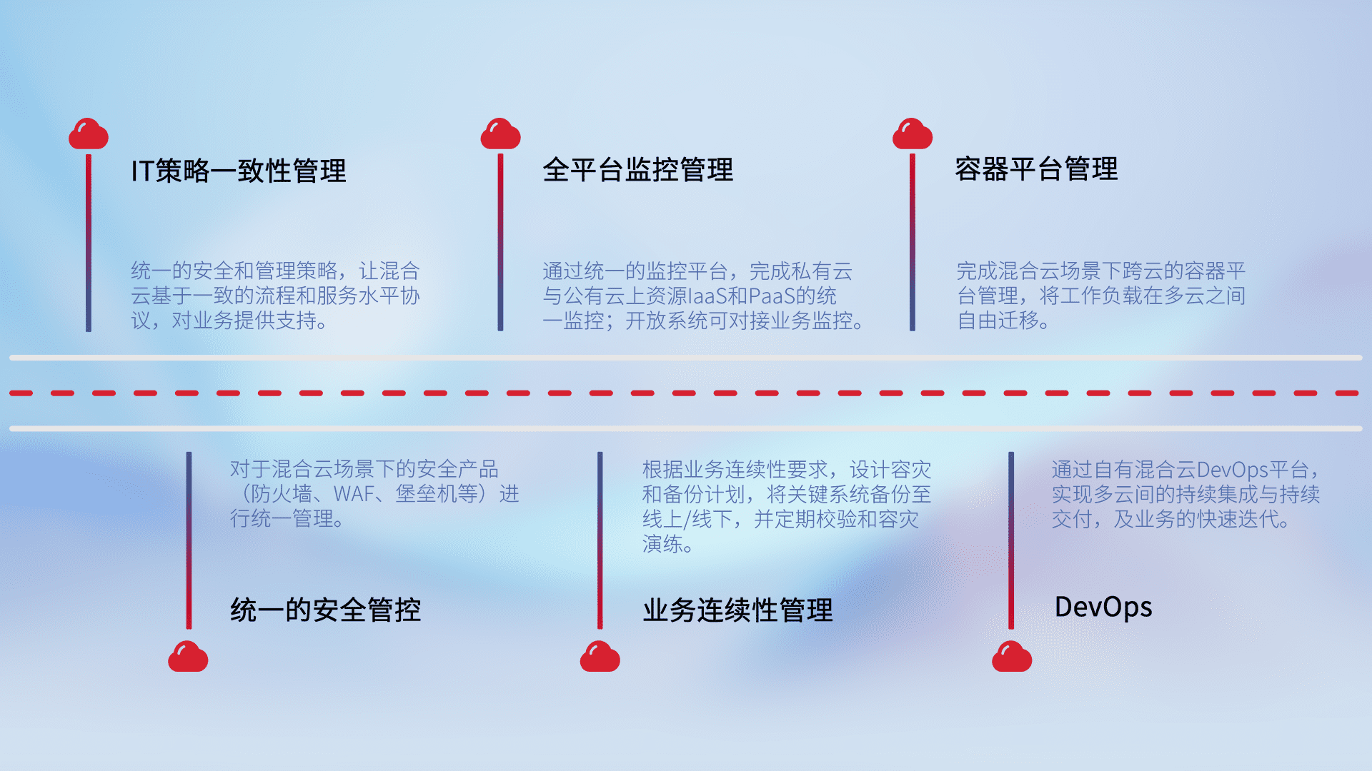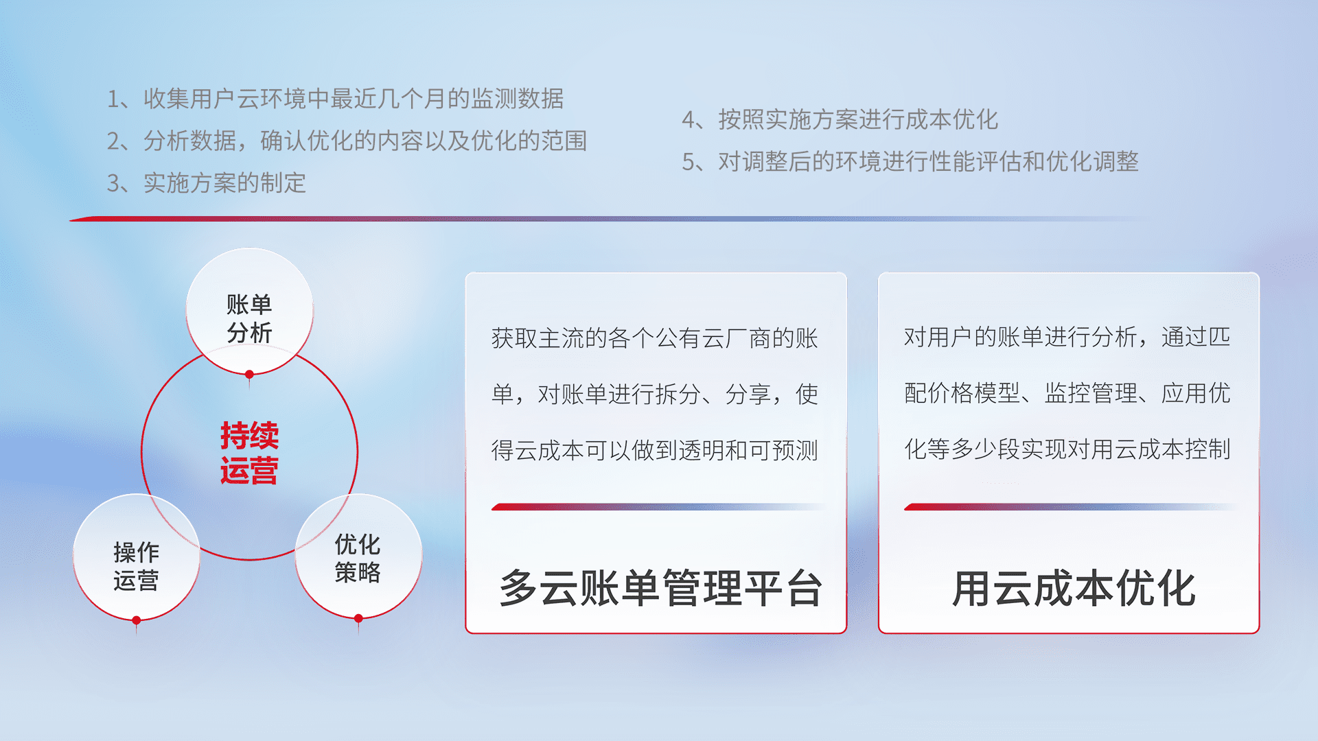 通过多云纳管,,,以统一的资源数据模型把客户的云资源进行抽象和封装,,,进而实现对多云资源的统一操作,,保障云资源管理的可靠性、、、、稳定性与可用性。。量身定制化运维内容,,配置、、、开发运维、、、补丁管理、、备份、、监控、、、认证和访问管理、、审计和日常巡检等,,保障在用云过程中的可靠度,,,,稳定度以及高可用率。。。