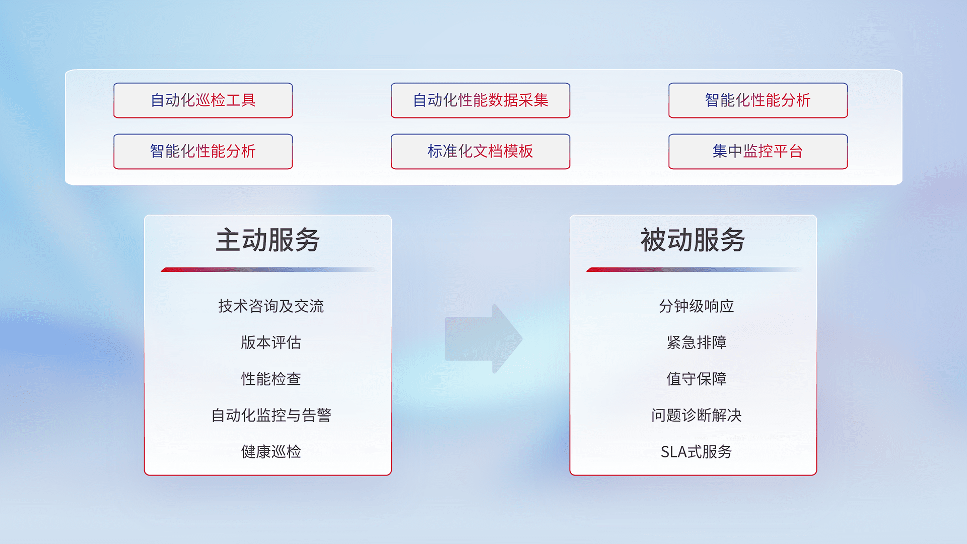 智能化工具和标准化文档,,保障服务质量,,,提供主动服务(包含技术咨询、、版本评估、、性能检查、、、自动化监控与告警、、健康巡检)和被动服务包含(分钟级响应、、、、紧急排障、、值守保障、、问题诊断解决、、、、SLA服务)。。